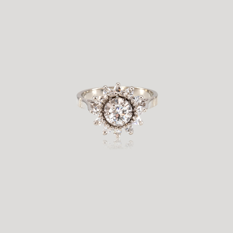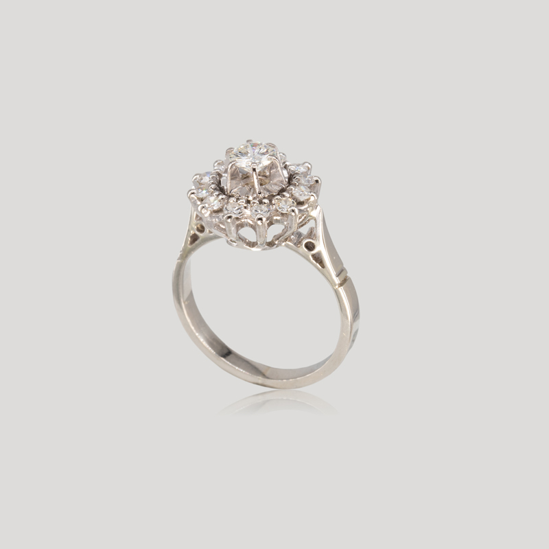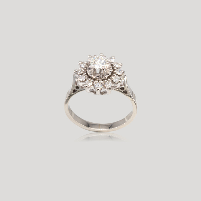 Cette bague ronde sertie d'un diamant rond central monté sur chaton à effet serti à 6 griffes et entouré de 12 diamants plus petits possède des proportions parfaites. Son panier fils et son corps de bague plat avec palmettes en pointes en font un bijou délicat et intemporel. Votre bague de fiançailles peut-être ?!