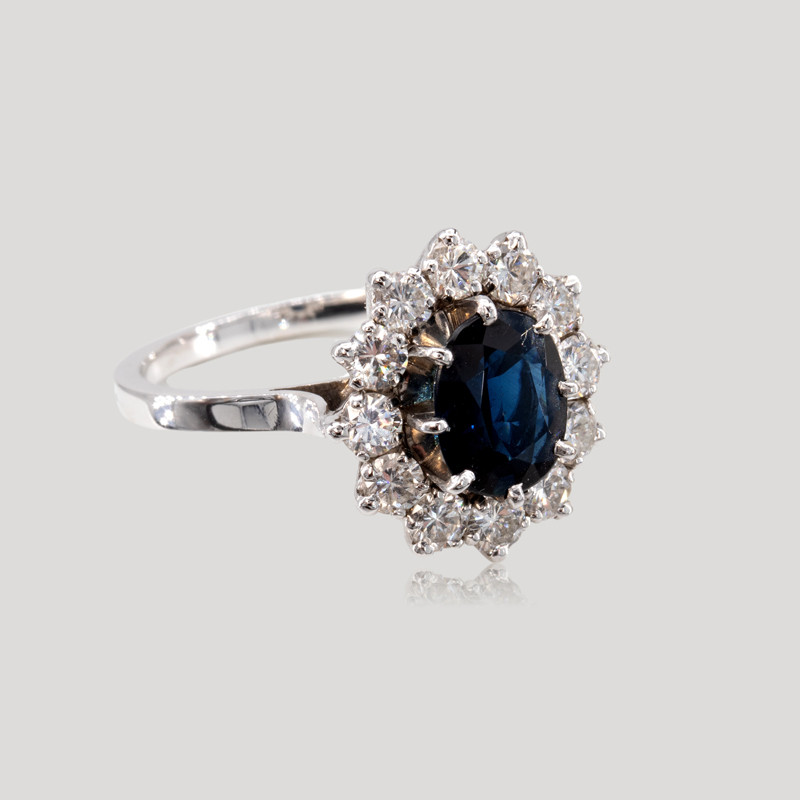 - Poids total en carats : Saphir : 1,60 carats estimés - 12 diamants : 0,96 carats estimés au total