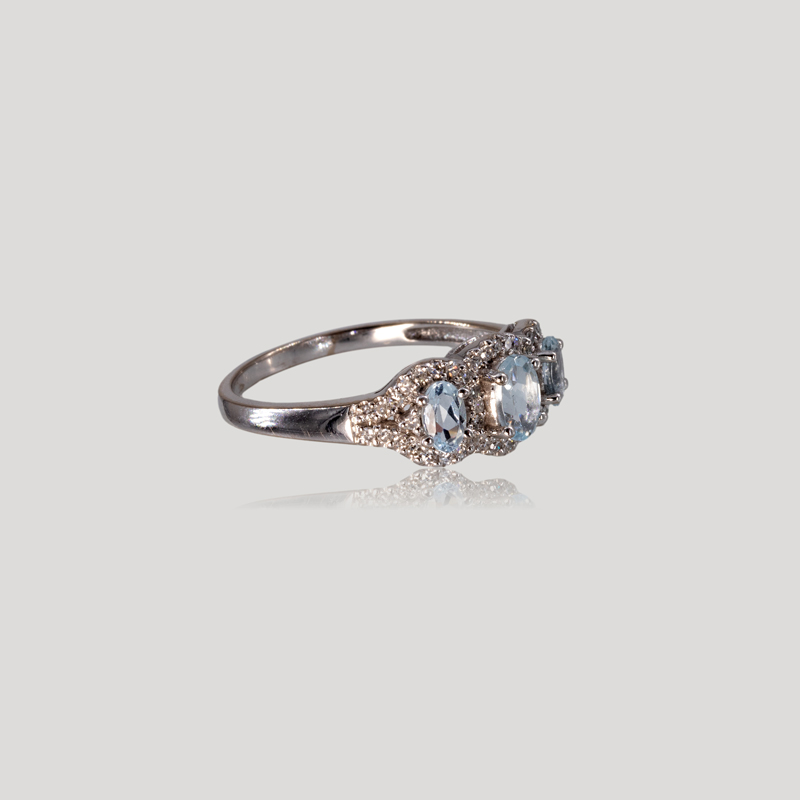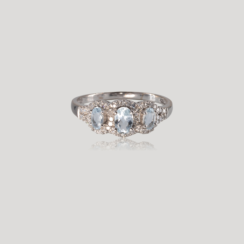 Ravissante bague jarretière mettant à l'honneur trois aigues-marines entourées et épaulées de diamants. La délicatesse des teintes et la monture de cette bague en feront très certainement l'anneau que vous ne voudrez plus quitter, hiver comme été !