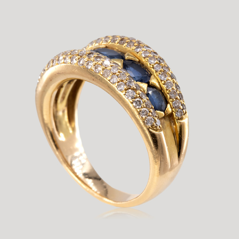 Comme entourée par deux lèvres pavées de diamants, une série de cinq saphirs ovales illumine ce jonc très empierré et forcément précieux. Il présente tous les atouts d'un anneau contemporain à porter au quotidien.