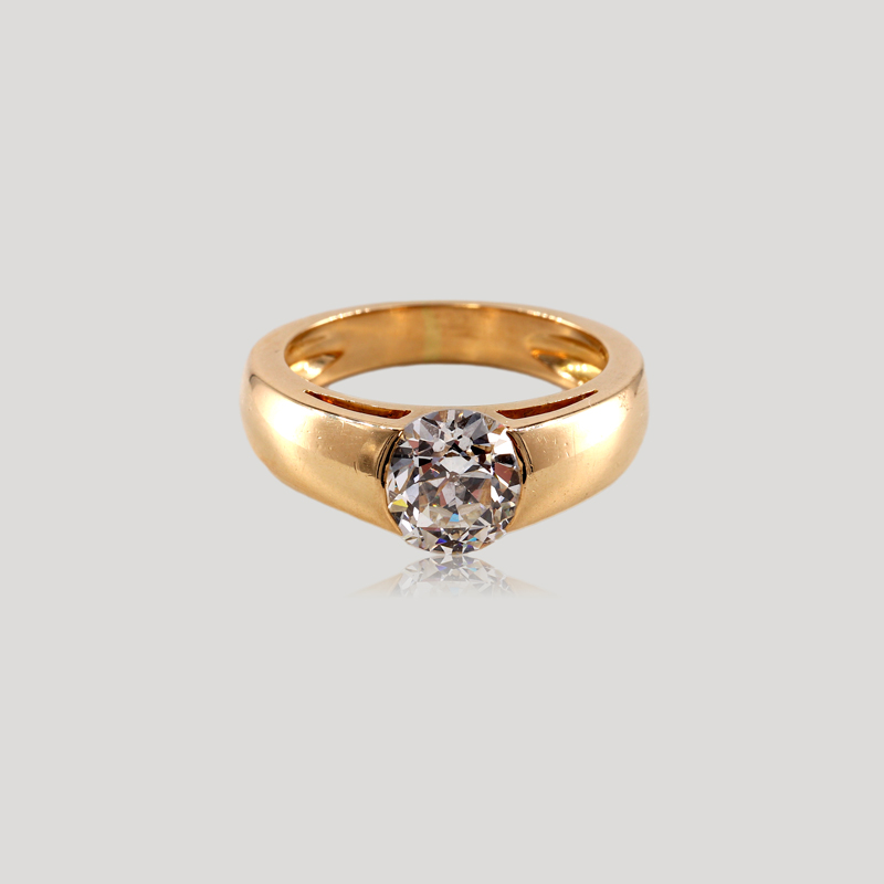 Remarquable jonc en or jaune serti d'un diamant taille ancienne de belle taille puisqu'il pèse 1,40 carats environ. Cet anneau comporte un charme fou malgré la simplicité de son dessin. Alliant la sobriété du jonc et la beauté d'une pierre ancienne, cette bague ne vous laissera sans doute pas indifférente.