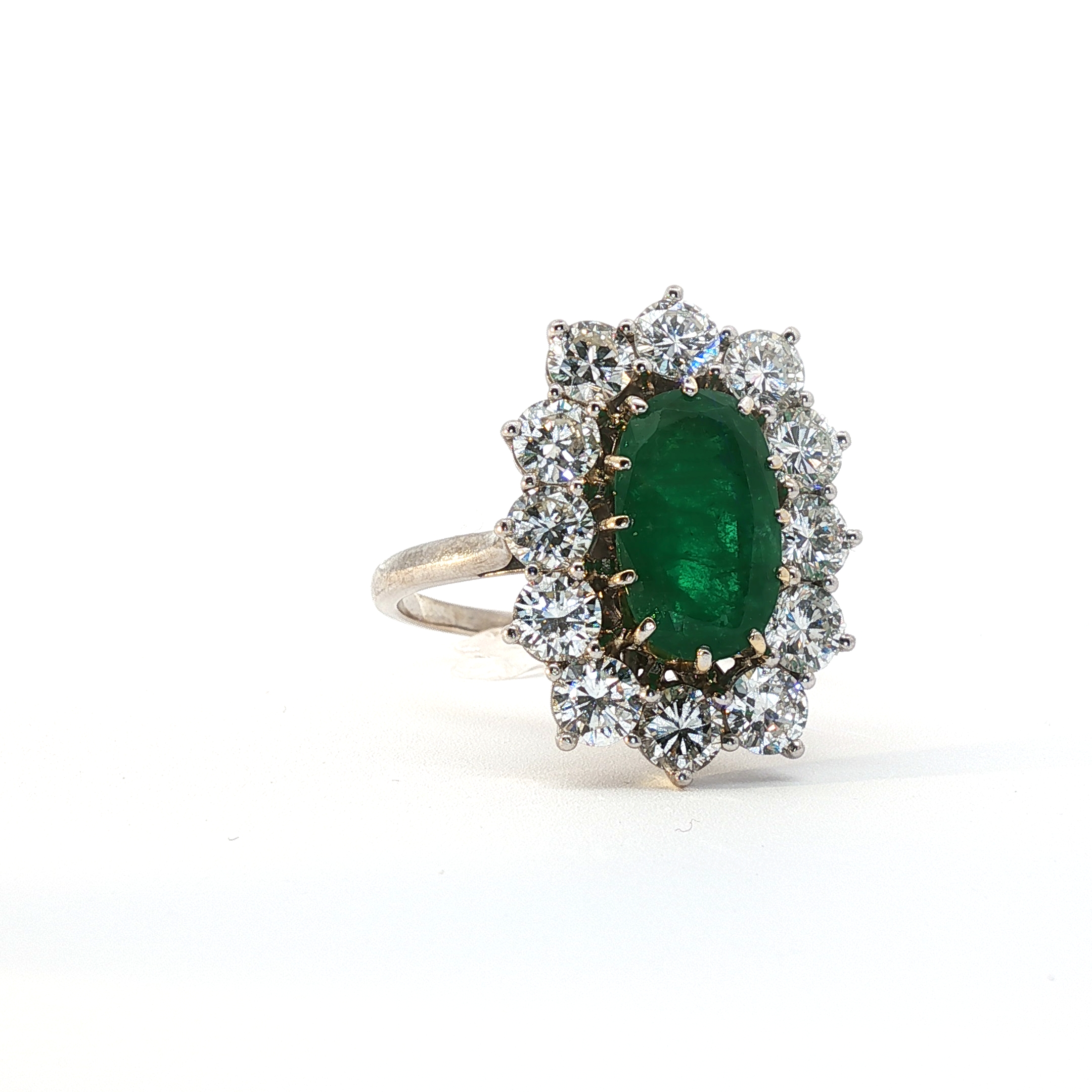 Au centre, 1 émeraude traitée ovale facettée sertie par douze