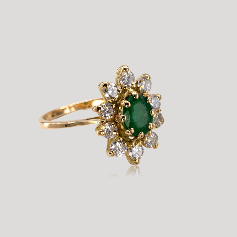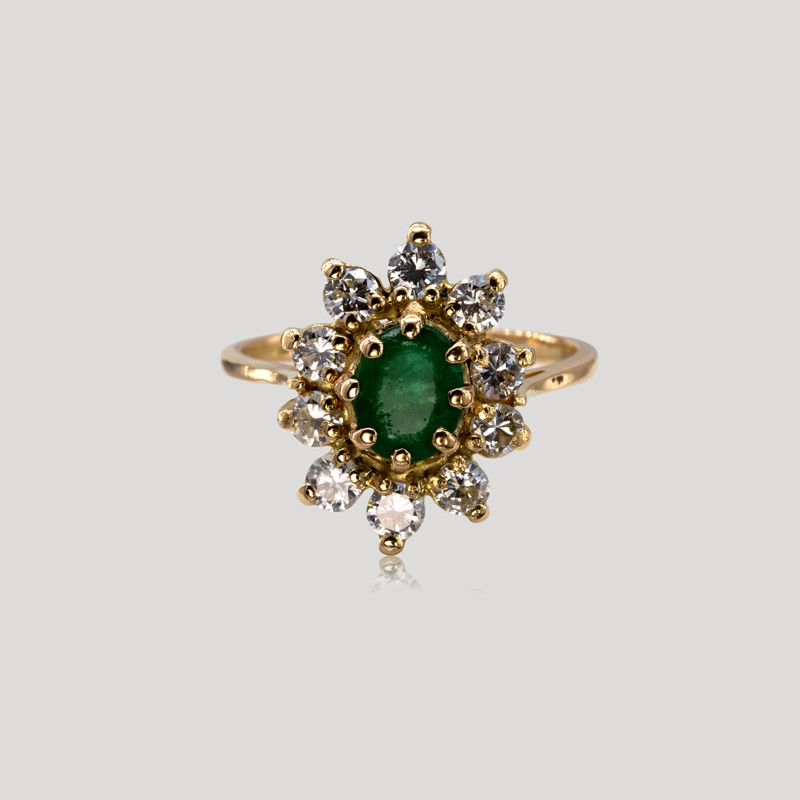 Fine marguerite au coeur planté d'une émeraude ovale facettée sertie à 8 griffes, entourée de dix diamants taille rond brillant moderne également sertis à griffes. Panier fils et corps de bague demi-jonc.