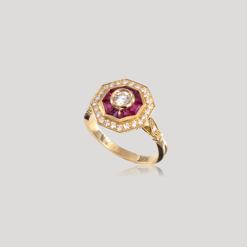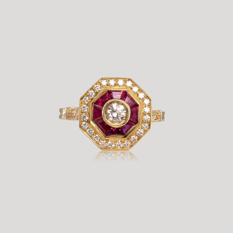 Flamboyante bague octogonale en or jaune accueillant en son centre un diamant rond en serti clos autour duquel rayonnent des rubis trapèzes en serti rail. Enfin, 24 diamants auréolent cette composition géométrique inspirée de l'Art Déco. Une bague solaire à l'allure intemporelle.