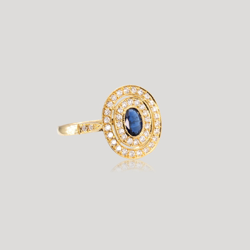 Bague en or jaune centrée d'un saphir ovale et dont les deux entourages de diamants illuminent la pierre centrale d'un halo précieux. Cette cible de gemmes et d'or forme un plateau épaulé de deux diamants en palmettes. Notez l'inspiration des débuts de l'Art Déco dans cette bague neuve qui n'attend que votre coup de coeur pour resplendir à votre doigt.