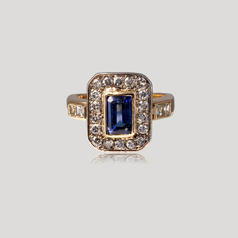 Autour d'un saphir taillé en rectangle à pans coupés, 18 diamants ronds finissent de faire briller la tête de cette bague aux formes inspirées des années 1930. En épaulement, deux petits diamants baguettes ajoutent allure et modernité à cette bague entourage.