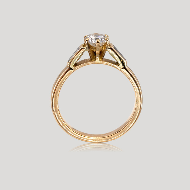 La composition de ce solitaire accompagné est d'une grande élégance avec le diamant central épaulé de duex diamants de forme trapèze. 0,72 carats de diamants au total se poseront à la perfection sur votre doigt. Qualité des diamants : GVS