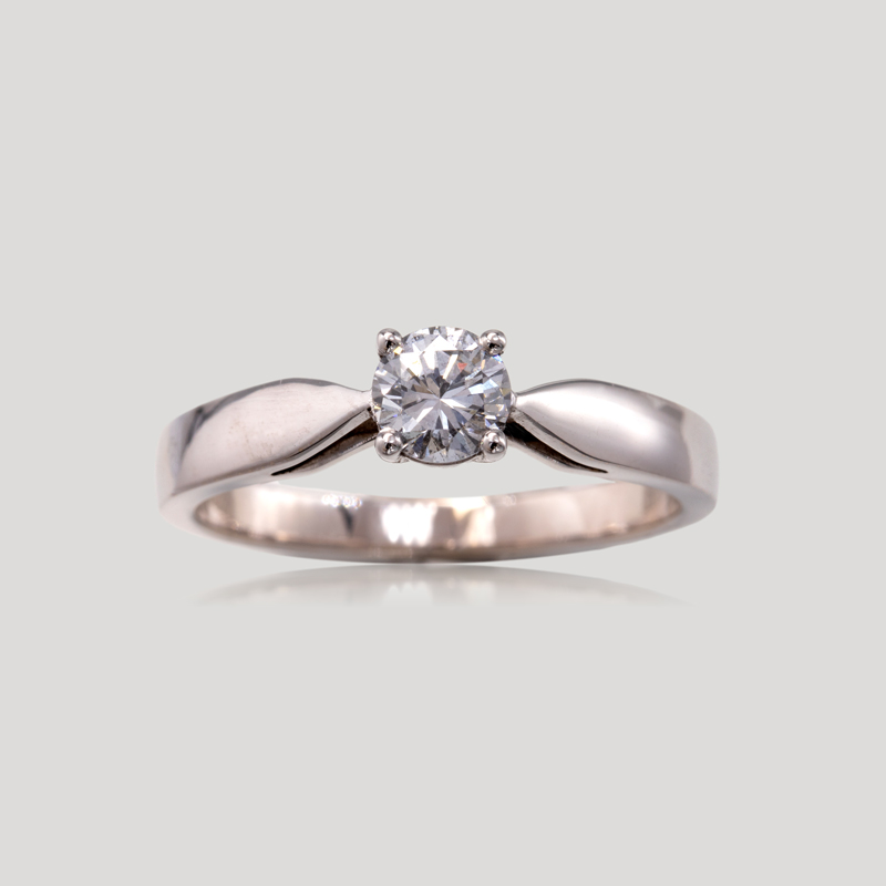 Surmonté d'un diamant taille brillant moderne d'environ 0,40 carat monté sur un chaton quatre griffes, cet anneau, dans ses lignes pures saura conquérir votre coeur. Corps de bague plat en chute avec palmettes à pointes.