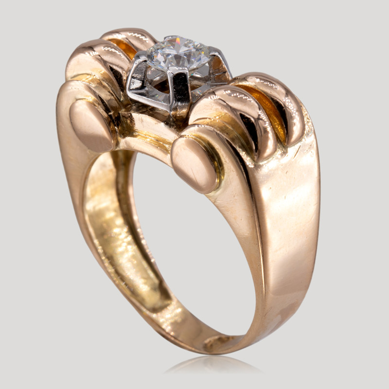 Bague tank en or jaune avec enroulements centrée d'un diamant taille brillant moderne de 0,55 carats. L'élégante architecture de cette bague est une superbe exemple de la joaillerie des années 1940.