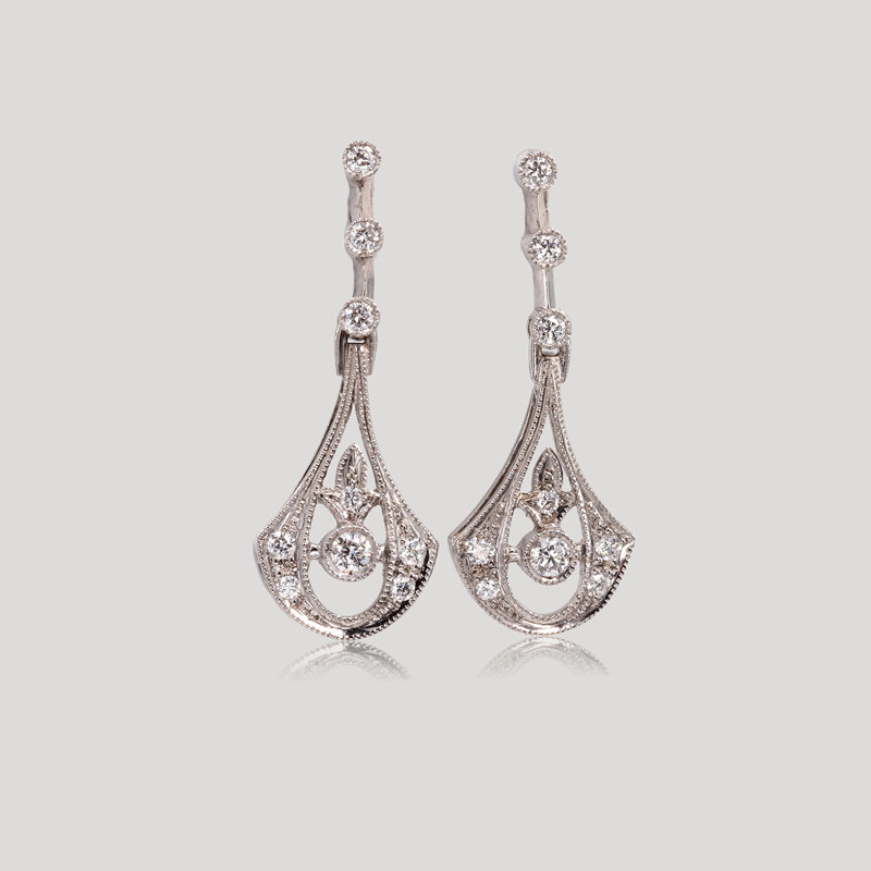 Boucles d'oreilles pendantes en or blanc 18K serties d'environ 0,30 carats de diamants. Dans un style Art Nouveau très séduisant, elles possèdent le charme de la légèreté et des formes qui commencent à devenir géométriques et stylisées.