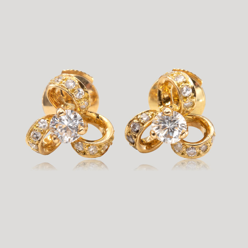 Paire de boucles d'oreilles en or jaune comme un noeud à trois boucles, évoquant un trèfle lumineux centré de deux diamants taille brillant moderne sertis à trois griffes. Fermoir système alpa.