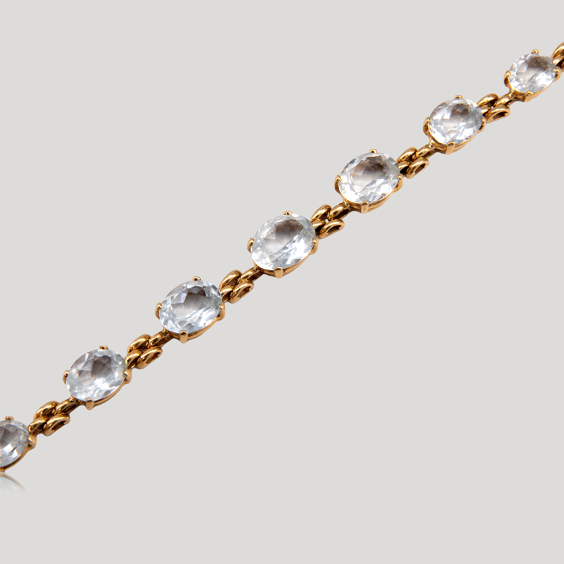 Bracelet souple en or jaune composé de 7 aigues-marines ovales facettées montées sur chaton à quatre griffes. Entre chaque béryl, une maille souple composée de quatre barrettes apportent solidité et lumière à l'ensemble. Parfait bijou pour l'été à venir. Fermoir cliquet avec chaînette de sécurité.