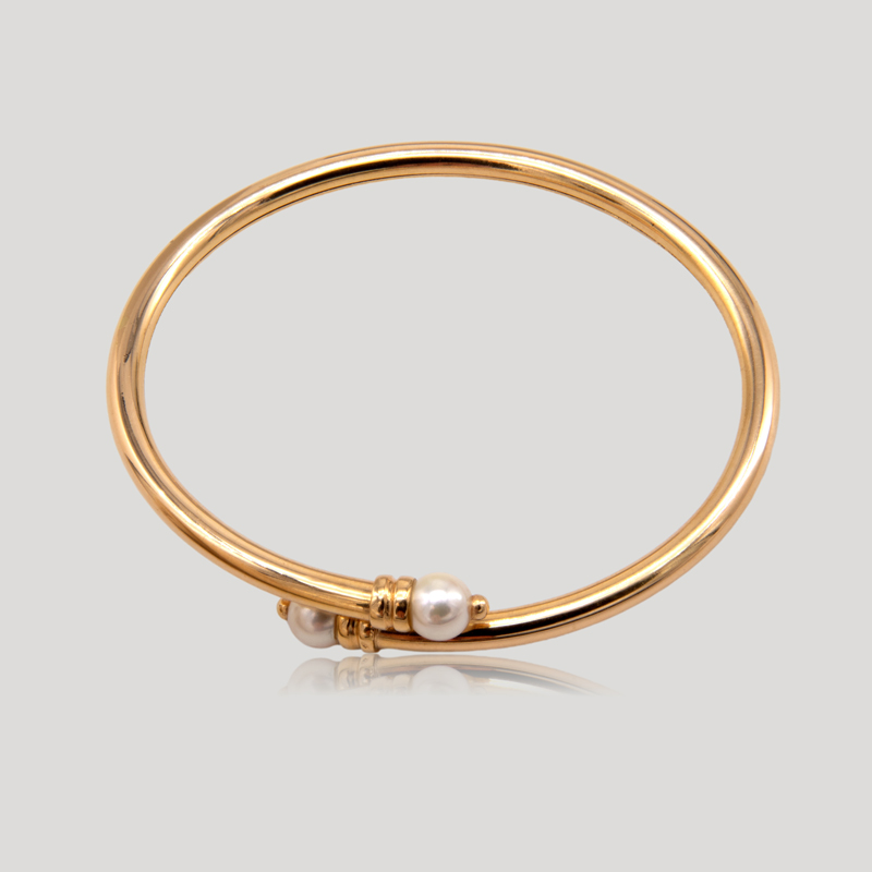 Ce bracelet offre la simplicité d'une ligne de jonc ouverte égayée par deux belles perles de culture. Il vous suffira d'écarter délicatement les extrémités de ce jonc d'or pour y glisser votre poignet ainsi enjolivé !