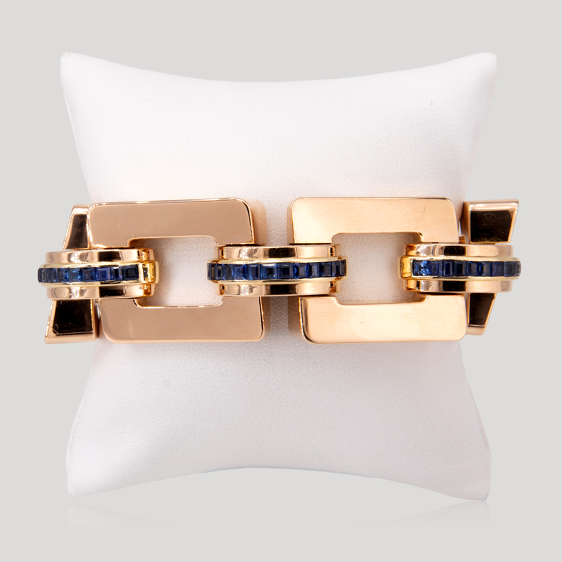 Cette très belle pièce de style Tank met en scène une succession de six maillons de forme rectangulaire et de six formes bombées serties de saphirs calibrés. Beaucoup de présence pour ce bijou rétro de superbe facture.