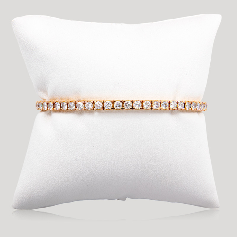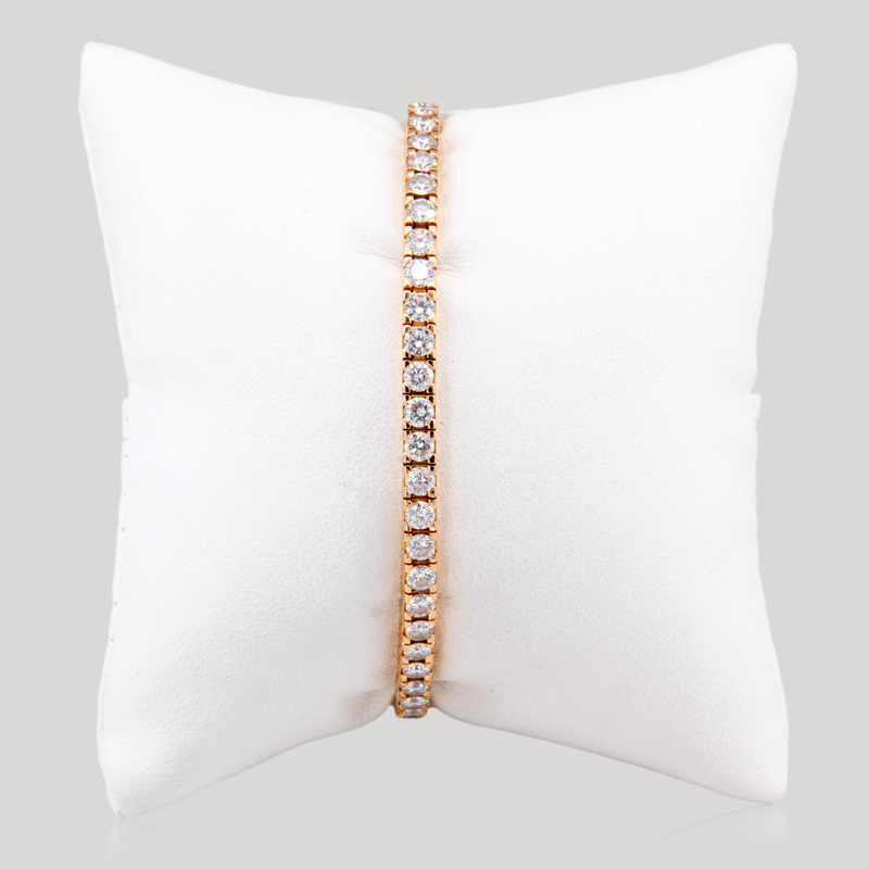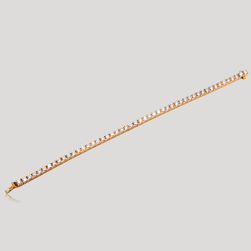 Que diriez-vous de vous attacher une rivière de 50 diamants ? Lumineuse idée n'est-ce-pas ? Sur or rose, ce bracelet tennis vous en offre une opportunité très élégante avec ses gemmes de belle qualité montées sur chatons quatre griffes. Fermoir cliquet et huit de sécurité.