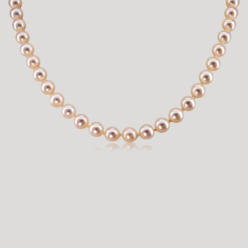 Ce collier de perles de culture est composé de 53 perles de même diamètre enfilées sur un fil de soie à noeuds. Fermoir barillet avec huit de sûreté.
