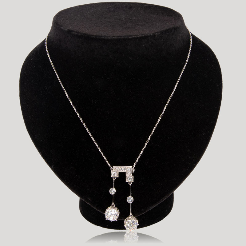 Somptueux collier négligé du début du XXe siècle composé de deux diamants principaux en taille ancienne sertis par huit griffes maintenus par de fines barrettes de platine articulées. Ces fines barres de métal précieux accueillent en outre chacune deux diamants taille ancienne en serti clos. Le motif supérieur est orné de sept diamants taille ancienne sertis en grains sur une chaîne maille forçat diamantée avec chaînette de sécurité et fermoir anneau ressort. Une véritable pièce de joaillerie Art Déco à porter autant que possible pour une allure au chic intemporel !