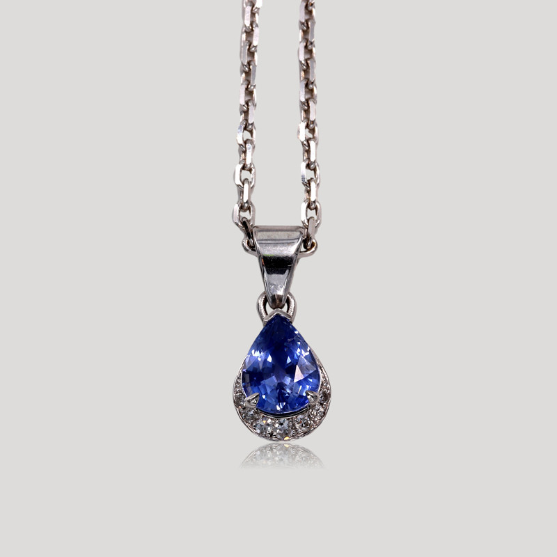 De fabrication maison, découvrez ce délicat pendentif en or blanc serti d'un saphir taille poire d'1,35 carats, et souligné de petits diamants taille brillant moderne. La bélière triangle lisse, tout en sobriété, permet d'y passer une chaîne ou un câble, pour un rendu classique ou moderne.