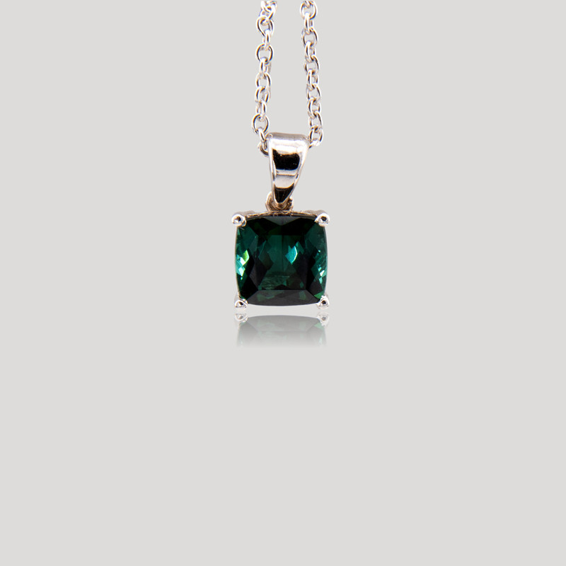 Pendentif en or blanc serti d'une tourmaline verte taillée en coussin carré monté sur un chaton serti à quatre griffes. Appréciez la profondeur de ce vert. Joli découpage du panier pour ce bijou qui est une création de la Maison.